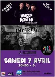 Le samedi 7 avril 2018 avait lieu à la MJC Boby Lapointe la soirée “La Rezonnerie”, en partenariat avec Rezonne (le réseau des musiques actuelles en Essonne) et en compagnie des groupes IMPARFAIT et TEACUP MONSTER.
